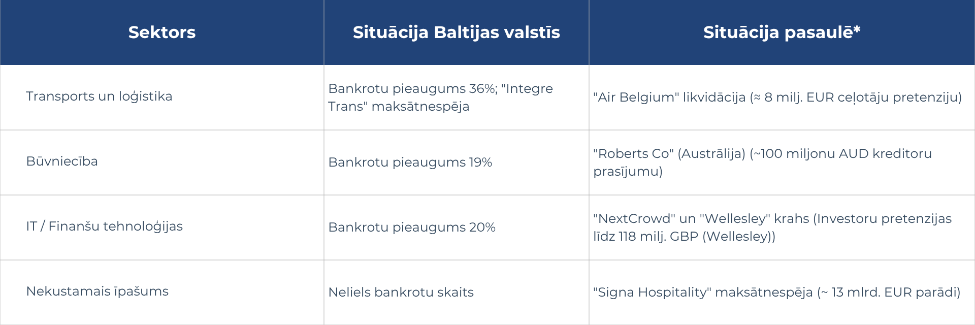 2024.gadā uzņēmumu bankrotu skaits pieauga visās Baltijas valstīs: Latvijā par 17% (no 242 līdz 283), Lietuvā par 16,1% (no 929 līdz 1 079) un Igaunijā par 12,9% (no 254 līdz 287).